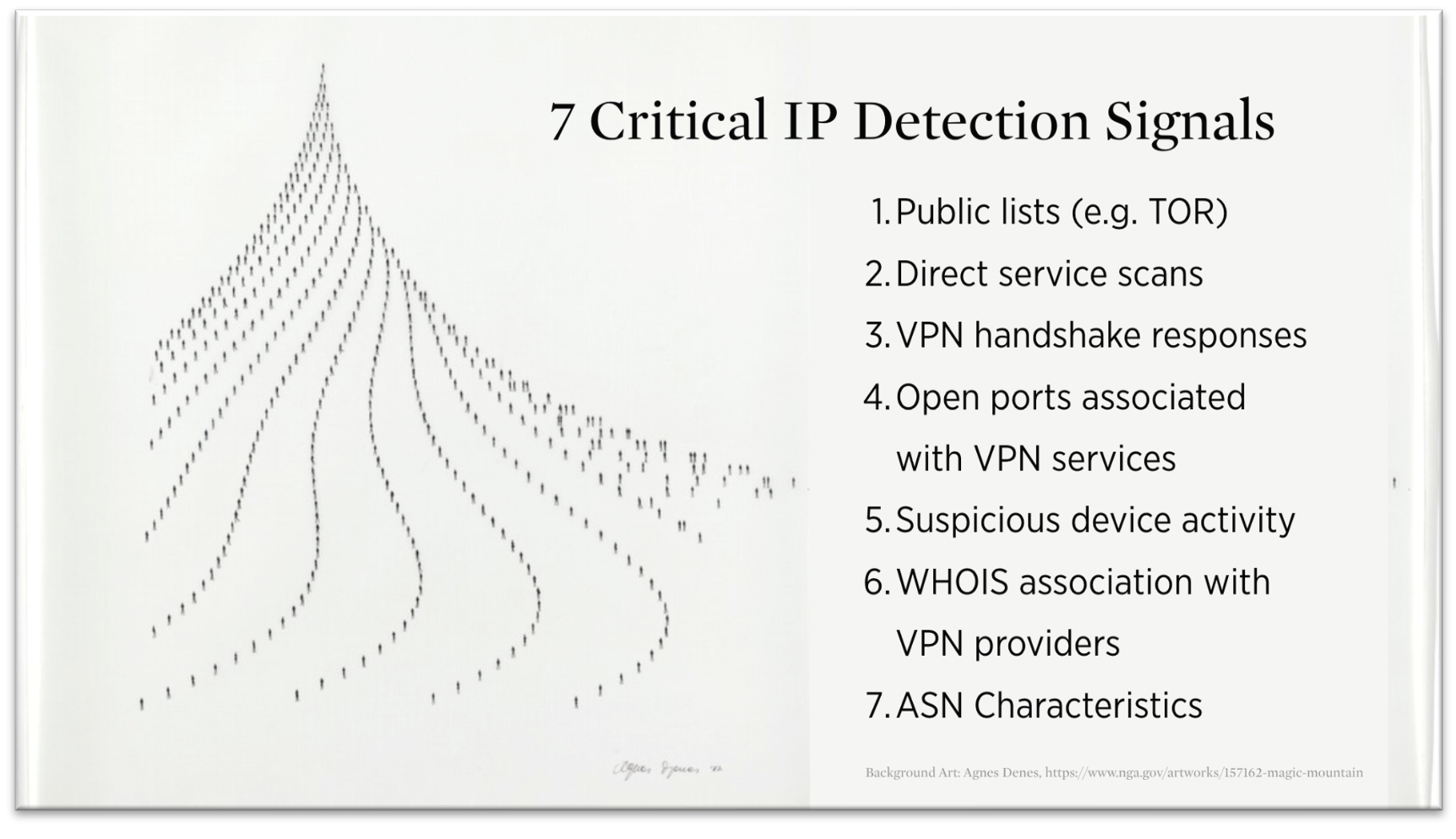 IP intelligence privacy research is a multi-layer process starting from key detection signals including public lists, probe network scans, VPN handshakes, open ports, suspicious activity, IP registration data, and hosting provider characteristics (ASNs, hosted domains, and port scans) to ensure highly accurate privacy and hosting detection.